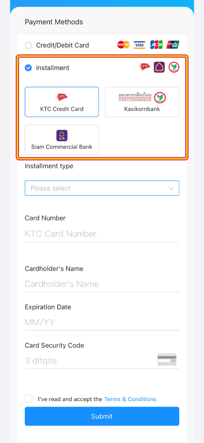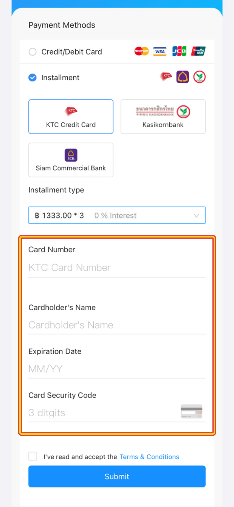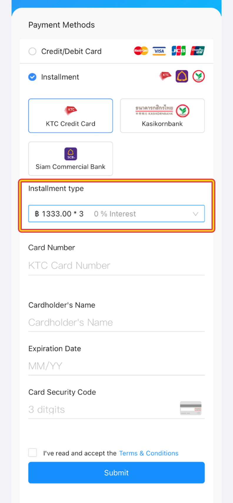 เลือก Installment และธนาคารที่ต้องการผ่อนจ่าย